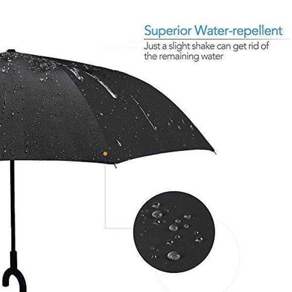 - SUPERIOR RAIN RESISTANT: The Canopy is made by 210T Pongee fabric which makes it good waterproof performance. The Reverse travel umbrella protects you in a drenching downpour with a high quality canopy coated with waterproof technology. Water won't soak through but instead beads up and bounces off, preventing the leakage you get with other umbrellas.