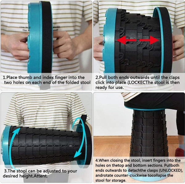 The new design allows you to open & close this retractable stool in 1s! You can grab both ends and gently rotate them in a counterclockwise/Clockwise direction to open or close. and it locks firmly in place once opened. Even a child can do it quickly and easily!